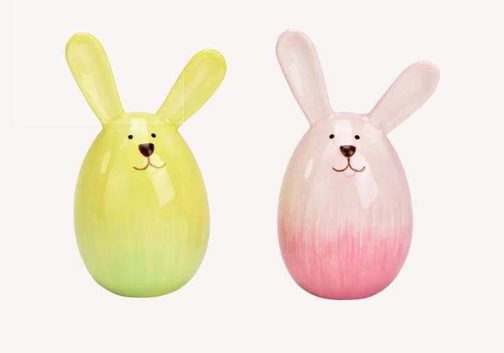 Leuk setje van 2 keramiek deco haasjes in groen/geel en roze tinten.
