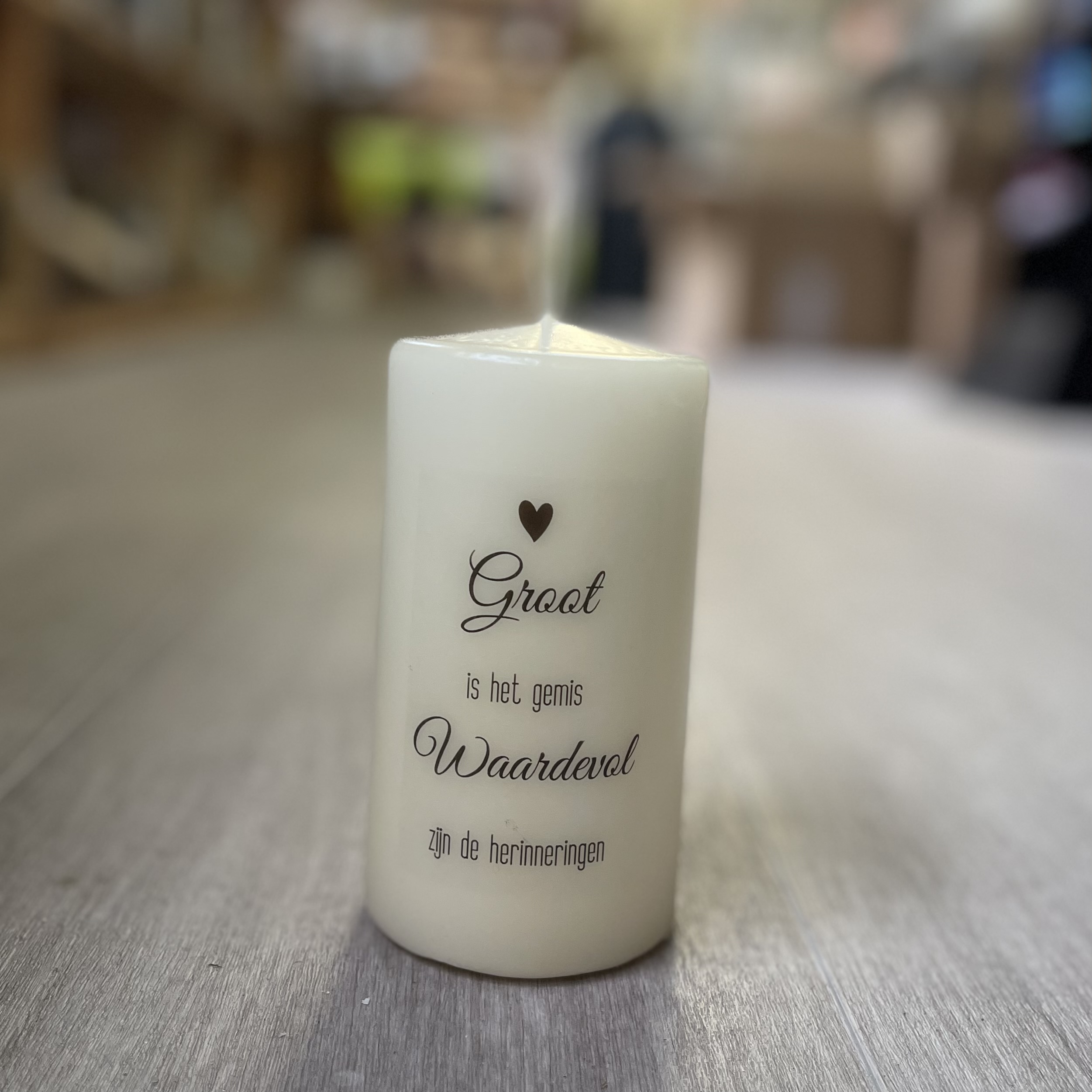 Stompkaars (7×13 cm) met de tekst “Groot is het gemis Waardevol zijn de herinneringen”