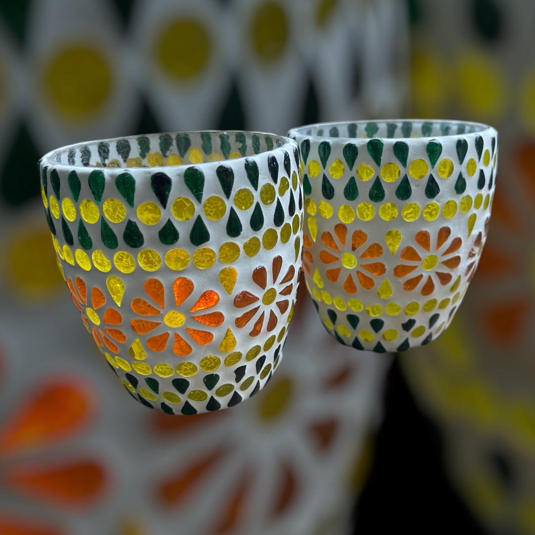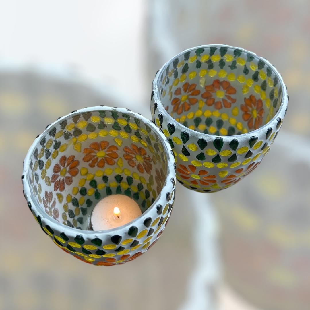 Twee sfeervolle waxinlichthouders met glazen bloemenmotief. Als er een kaarsje in wordt gebrand, schijnen ze prachtig door!